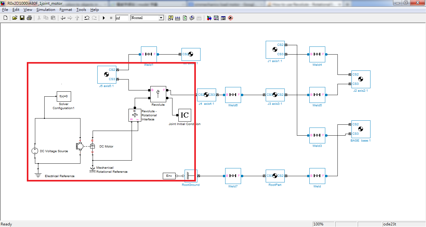 我试着在SimMechanics中旋转机器的旋转关节。执行器来自SimElectronics,所以我使用旋转-旋转接口块将电机和关节连接在一起。整个块模型如下(也是可用的这里)