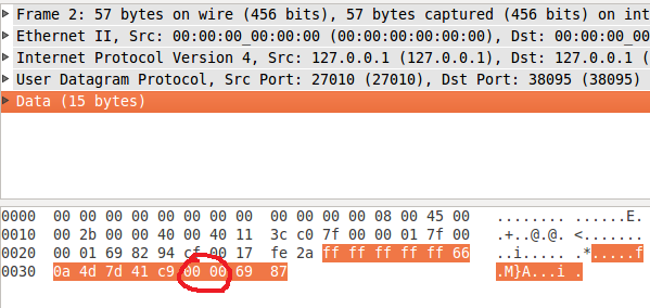 问题是端口号是一个2字节值,但是您处理的是4字节值。如果你仔细观察,你会发现你有8个字节,而不是6个,两个“重要”字节出现在这些零之后。