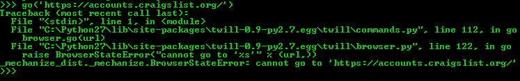 我刚刚得到了Twill,并在玩它,它似乎有麻烦的HTTPS网站。例如,命令go('http://boston.craigslist.org/')将很好地连接,但go('https://accounts.craigslist.org/')失败。在尝试连接到其他HTTPS链接时,也发生了同样的事情,但是HTTP链接没有问题