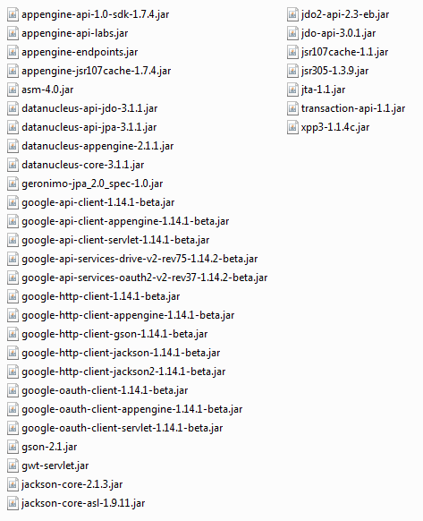 我想更新我的GAE网络应用程序使用JPA2.0。在文档这里中,它说我必须将appengine-java-sdk/lib/opt/user/datanucleus/v2/的内容复制到项目的lib文件夹中。