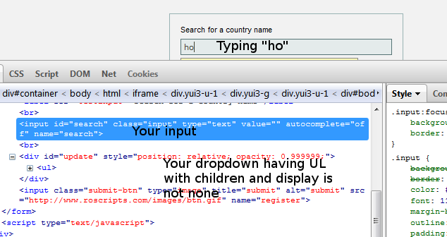 当您键入某些内容并完成xhr请求时,结果应该有一个UL元素--当我在http://www.ajaxdaddy.com/scriptaculous-autocomplete.html上使用它时,请参阅下面的图像