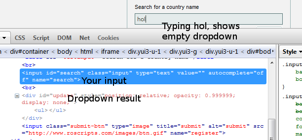 在安装了Firebug的FireFox中,您可以右键单击文本框,然后选择“使用firebug检查元素”,如果将firebug窗口停靠,您应该会看到元素,元素下面是“下拉”结果。