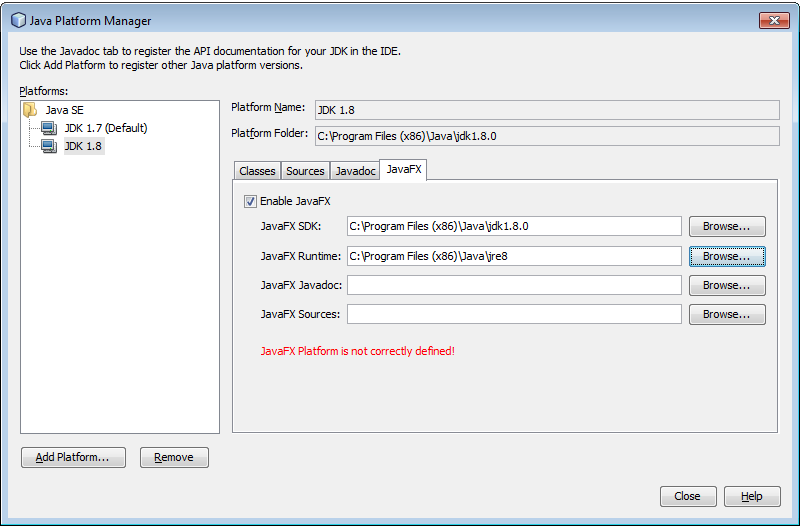 我正在使用JDK 8早期访问(Build 90),在windows中使用Netbeans 7.3,但是在JavaFx中启用JavaFx时,它说JavaFx平台没有正确定义。我试图给出jre8路径,但错误仍在继续。当我将JavaFx运行时设置为JRE1.7时,错误不会显示出来,但在这种情况下,我的JavaFx代码是由JDK8编译的,但它试图使用JRE7运行,结果出现了无法比拟的类版本错误。