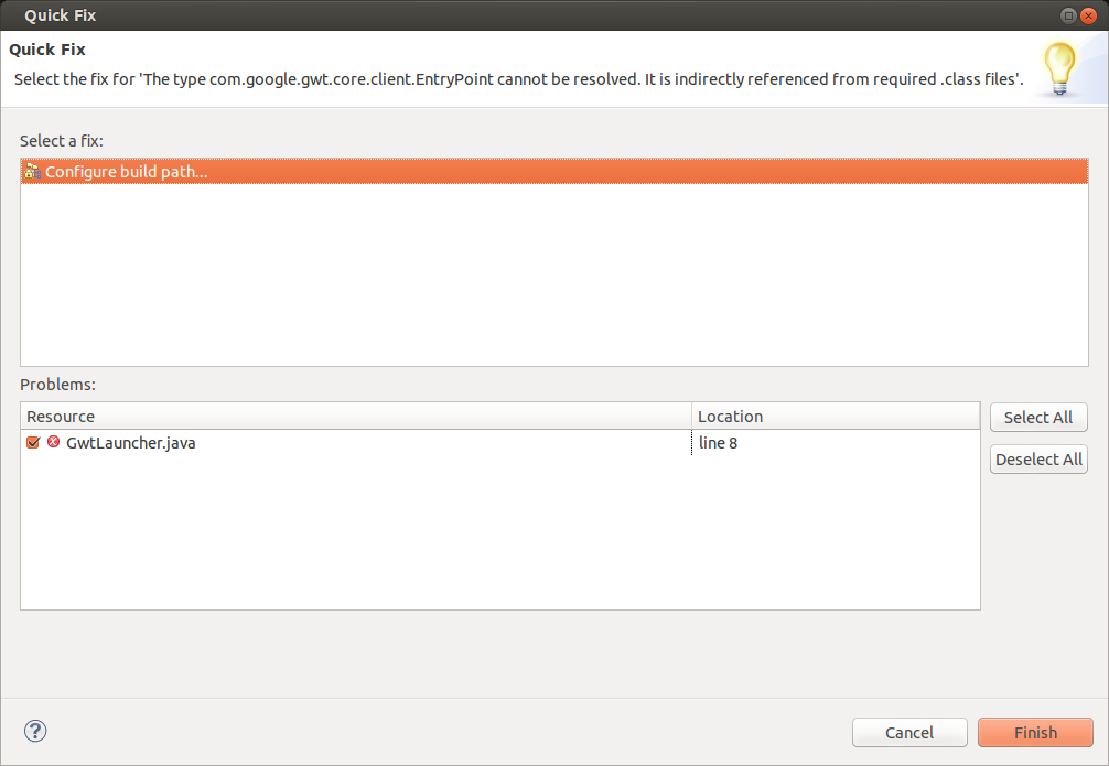 我得到了同样的问题,并通过进入Preferences > Google > Web Toolkit解决了它,然后删除显示错误(可能指向错误文件夹)的GWT路径,并检查显示工作正常的路径。