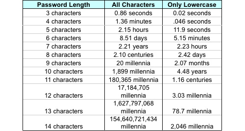 密码最少有6个字符是不够的,至少要有8个字符。一个相关的图像,我还没有验证时间,但它给出了粗略的估计,并给出了总体想法(不包括字典攻击,它可以针对更长的密码):