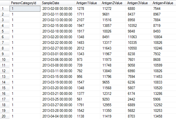 );通过这种方式,您可以在personCategoryId和AntigenNum (1、2、3等)上加入表。你就会明白我为什么马上提出这个建议了。
