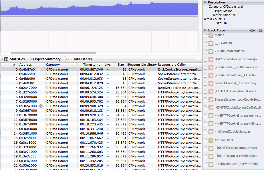 好的,解决方案是CFData (store)似乎负责在使用NSURLConnection的时候将url缓存保存在内存中。