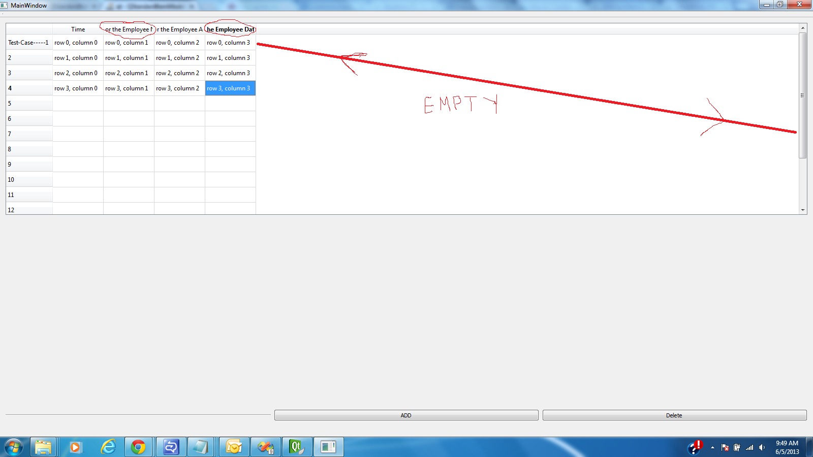 我在QTableView中使用QTableView。这里我有两个按钮& Qtableview在我的主窗口中。我只需要4列在这里面。行也会不同。这两个按钮将用于添加/删除一行(测试用例)。