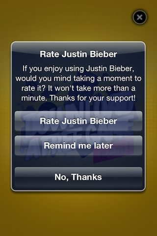 在我的应用程序中,我使用了、Appirater、和工作,individually.When Appirater给了我警告,我选择给应用程序打分,它将打开应用程序的视图非常完美,但是当有了are‘s,全屏在那里,在Appirater弹出窗口警告时,rate应用程序将无法工作,并且会做更多的细节,我添加了图像。