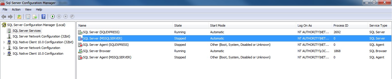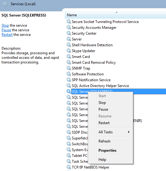 - Restart the SQL Server service (Shortcut: Winkey + R then `services.msc`)