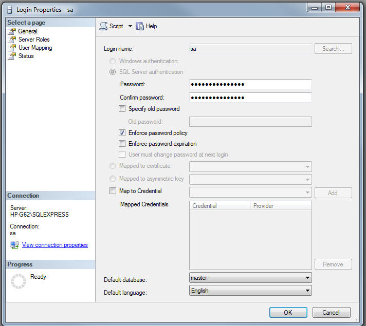 在运行“MSSQLSERVER (MSSQLSERVER)”之后,我可以以'sa‘登录到我的服务器。