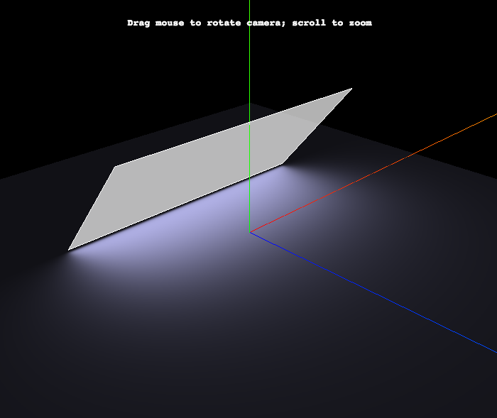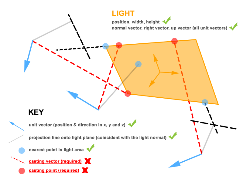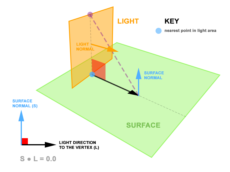 区域光既垂直于表面,又与表面相交。表面上的每一个碎片都会返回一个最近的点,在表面与光相交的区域光上。由于曲面法向量和顶点到光矢量总是垂直的,它们之间的点积为零。随后,尽管表面有很大的光面积,但漫射贡献的计算为零。