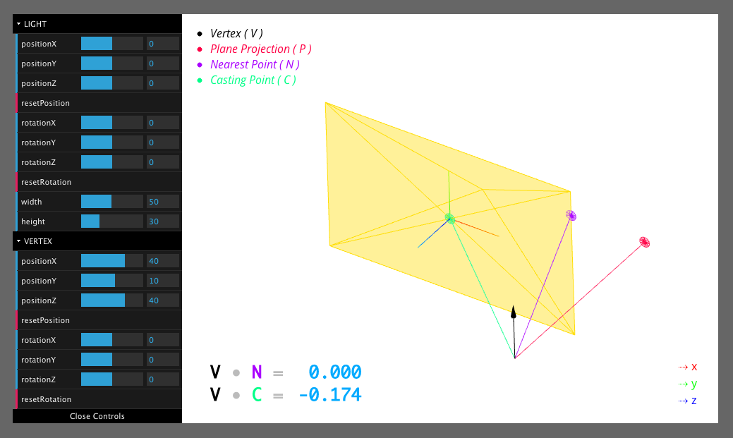 castingPoint.location是THREE.Vector3的一个实例,也是拼图中缺少的部分。您还应该注意到,在草图的左下角有两个值-这些值是动态更新的,以显示相关向量之间的点乘积。