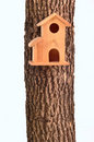 Situation:我有一个树干的图像在我的基础层,在中间有一个鸟舍。这鸟舍有它自己的层。我想使用鸟舍层作为一个‘曲奇刀’,以便很好地切割出鸟舍的形状,以便我可以在它的地方放一些其他的东西。