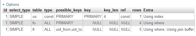 EXPLAIN如果我们使用us.uid来匹配用户(因为它是索引的):