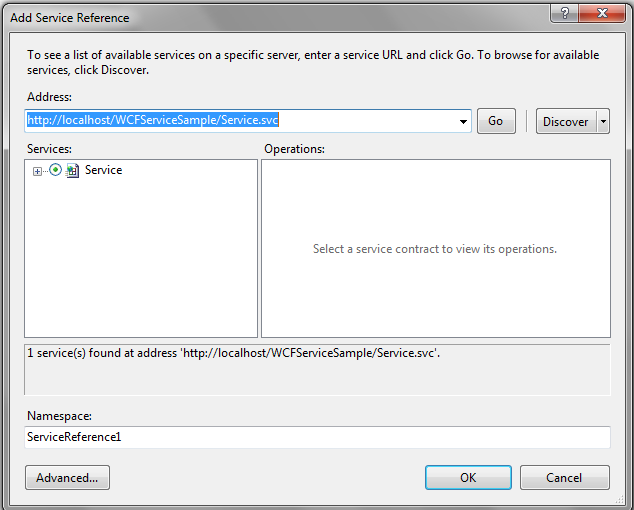 在“address”对话框中,输入服务的地址(在您的例子中是http://[host]/expwebhttpsampledesktop/service1.svc),然后单击“Go”为向导自动发现服务方法。最后,更新服务名称空间: