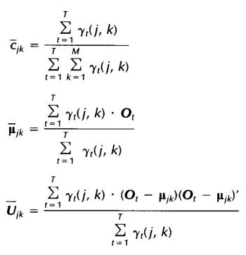在Rabiner的纸中,GMMs (权值、均值和协方差)的参数在Baum算法中被重新估计,使用以下方程: