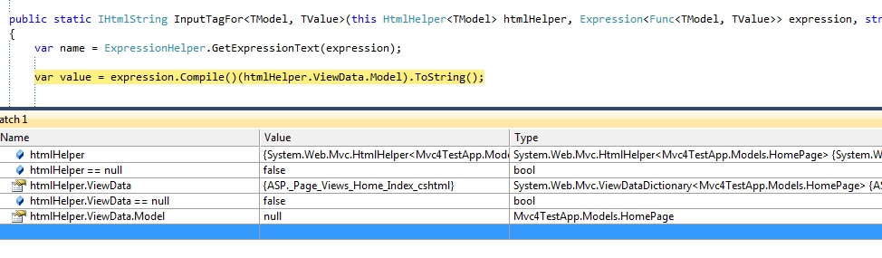 更新助手方法的截图在一个断点,与手表窗口显示值的htmlHelper.