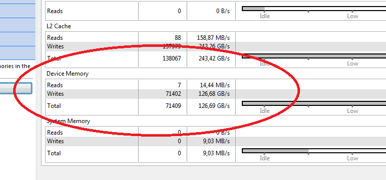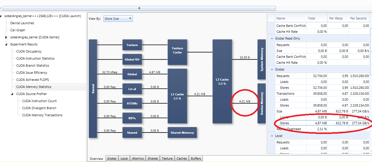 Nsight表示4.21MB存储,可视化分析器表示71402个事务,代表8.9 of (假设它们都是128 B)。因此,Nsight称BW为277 is /s,可视化分析器为126.69GB/s
