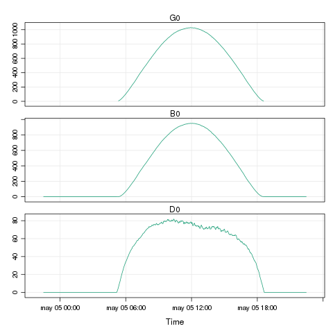 z <- zoo(sol_data[,c('G0', 'D0', 'B0', 'Ta')], idx)因为你的数据属于晴天,而这个时间序列使用的是平均太阳时间,所以最大值应该在中午左右。