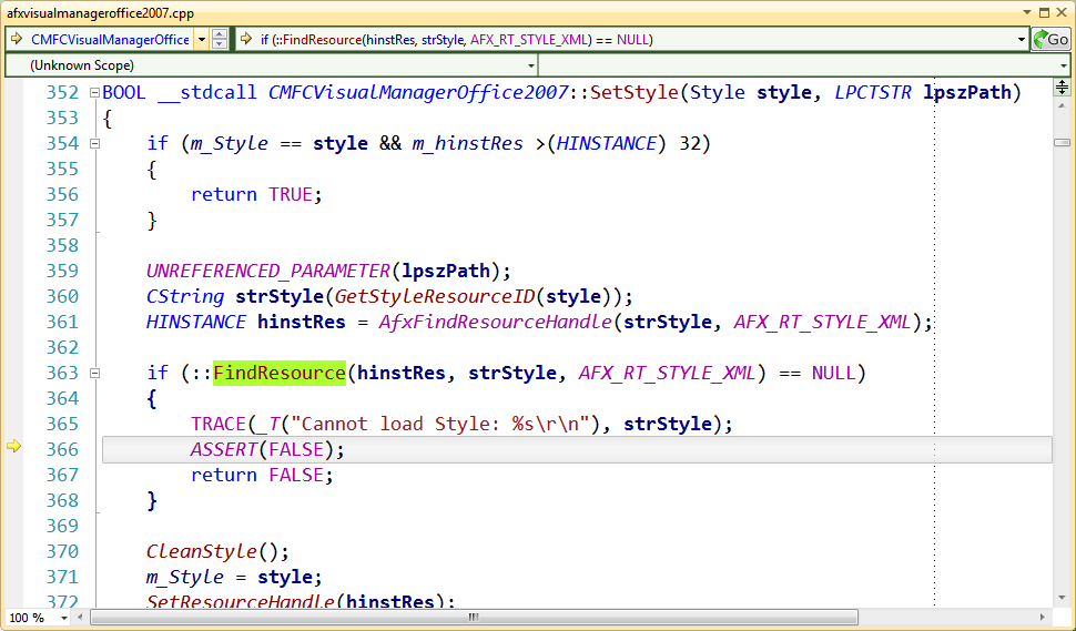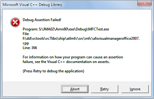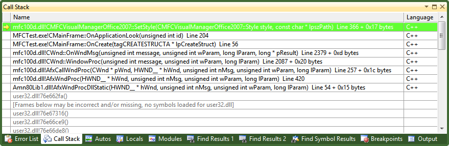 在您的示例中,我无法在调用堆栈的下面看到函数,但是如果它是导出的函数,则MFC状态问题很可能是正在发生的。