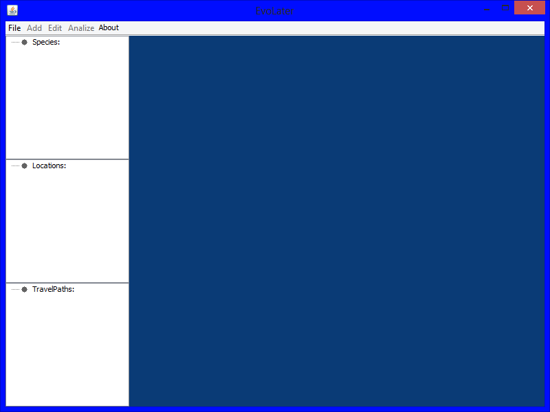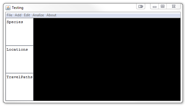最初,右下角的空白区域是一个面板,它的目的是绘制样本、位置和旅行路径的可视化表示(这并不重要)。但是,您将能够打开某种类型的窗口,允许您创建/编辑不同的项目(如物种、位置和旅行路径)。最初,我计划那些只是弹出窗口。但是,我想我可能会使用JInternal窗格作为弹出窗口和可视化表示屏幕。