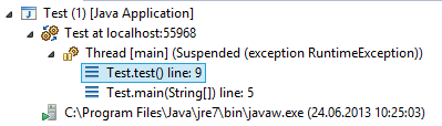 at LineNumber.main(LineNumber.java:5)您不能在这里直接检查异常(据我所知),因为它不是在变量中捕获的。但是,如果在异常挂起时进入Preferences -> Debug -> Open弹出,Eclipse将创建一个pop,其中包含可以检查/钻入的异常(行号正确)