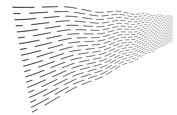 理论上,您可以这样做,如果您有描述每一行的贝齐尔集,然后设置这条线的破折号模式。破折号图案将是不统一的,并指定涵盖整个长度的每一条路径。
