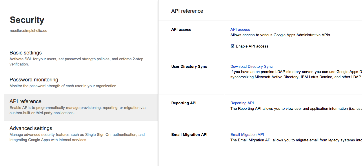 google技术支持指示我使用Provisioning,wich是不推荐的,因为它应该允许您创建一个管理用户,而不需要在每个域手动启用API访问。当我尝试这样做时,我会面临这样的错误: