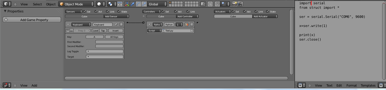 }事实上,当搅拌机游戏引擎(BGE)运行时,我按下“a”键与arduino和LED连接。