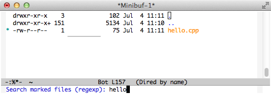 然后在字符串"hello“上运行dired搜索,找到字符串,但不会突出显示,如下所示。