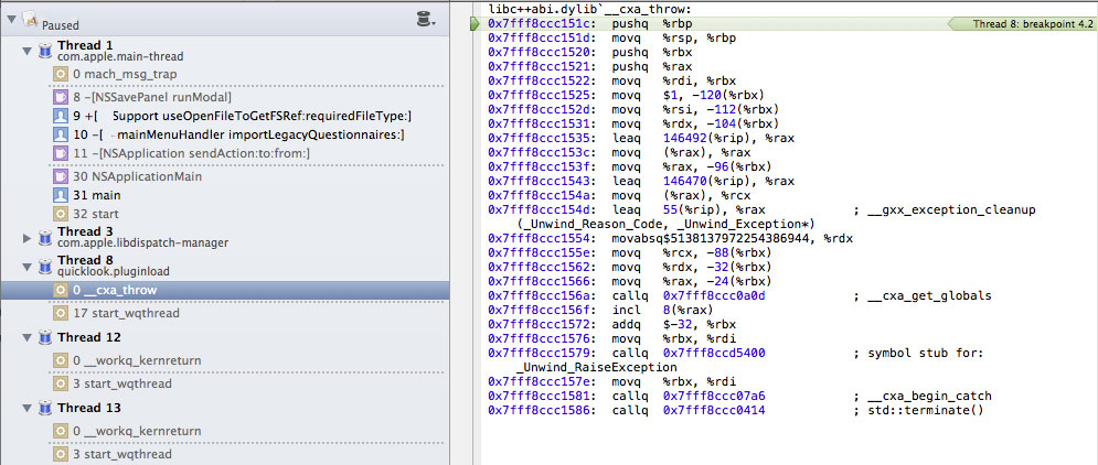 NSOpenPanel crashes when debugging with Xcode 4.5.1