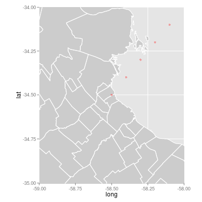geom_point(data=df, aes(x=long, y=lat), colour="red", alpha=30/100) +