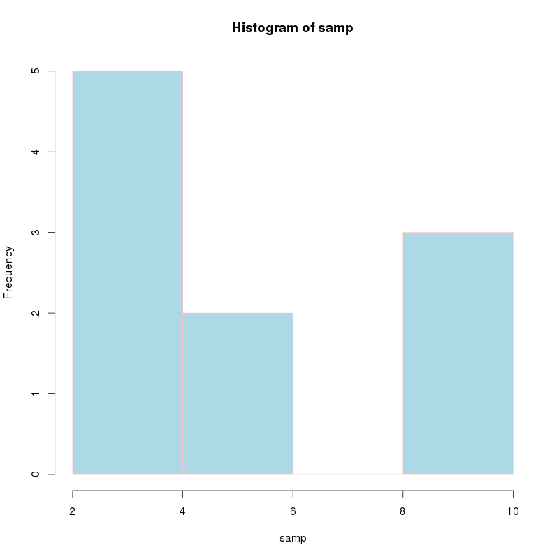 hist(samp, breaks = 3, col="lightblue", border="pink")
