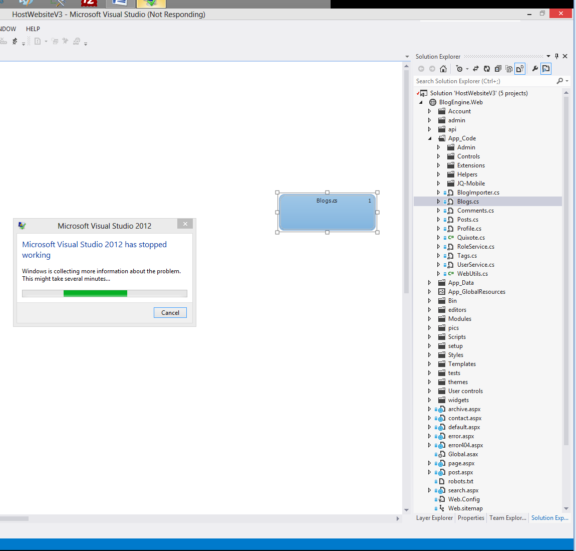 当我试图将解决方案资源管理器中的任何类拖放到建模项目中的图层图中时,Visual将停止工作(没有响应),并将重新启动。