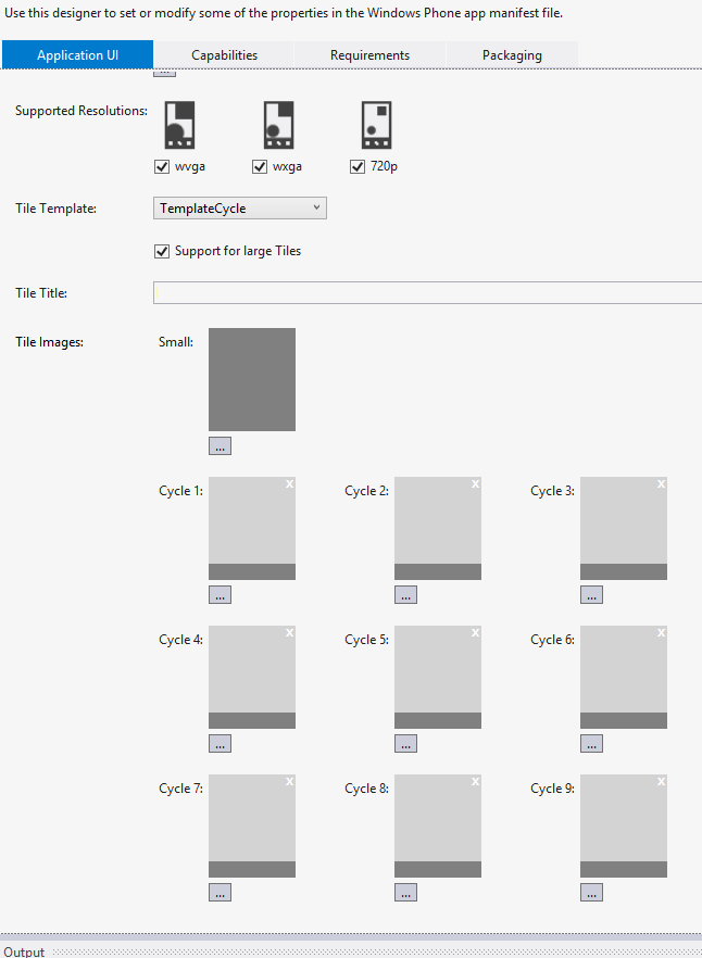 似乎没有使用小循环瓷砖的样品。另外,这是VS2012 WMAppManifest.xml的截图。只有一张图片代表“小”。