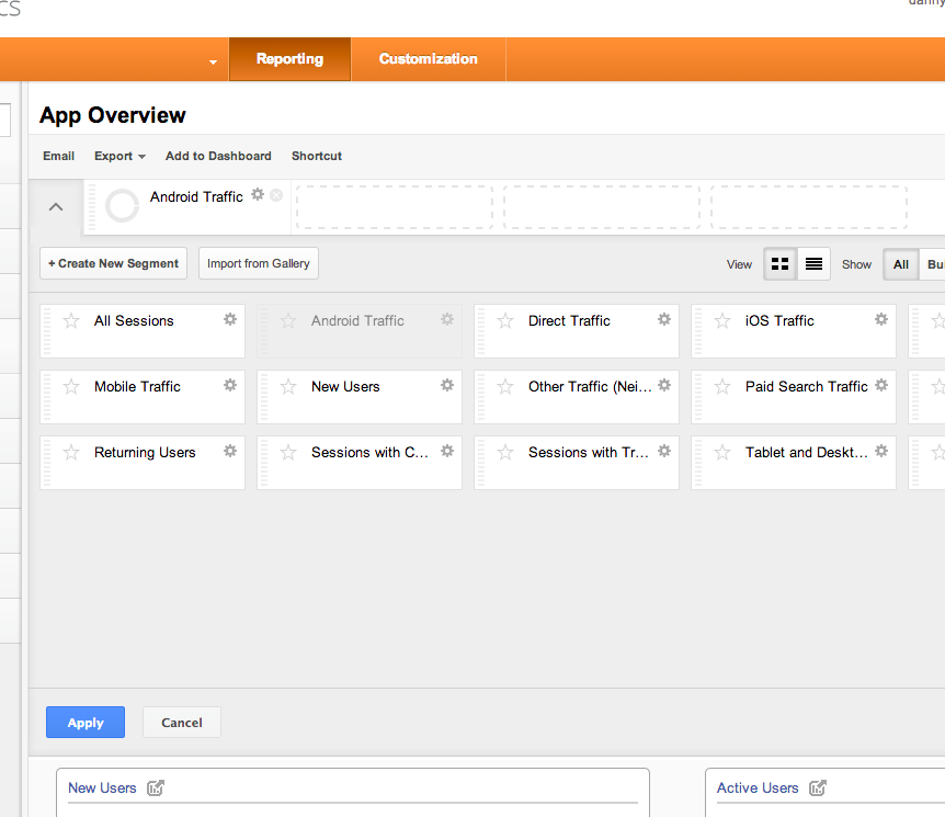 在报告视图中将数据分解成不同的分组。对于移动应用程序,"Android流量“和"iOS流量”是内置的两个部分。