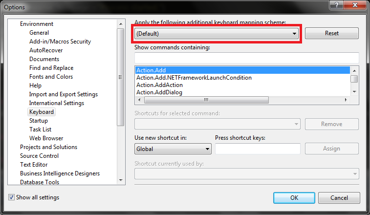 我也有同样的问题。我还在使用2008。只需单击tools>>option>>environment>>Keyboard。然后设置
