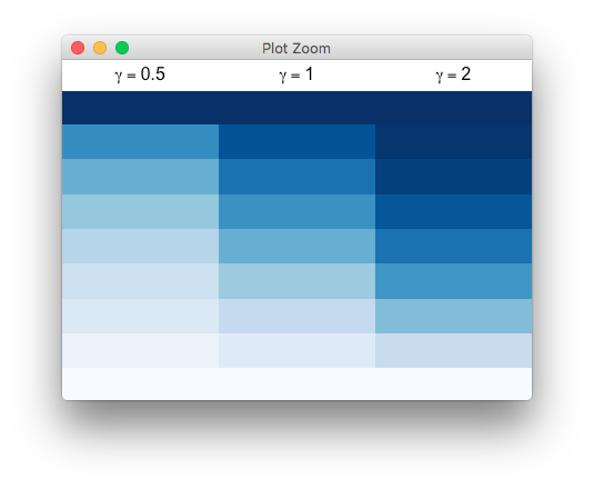 作为这种非线性调谐参数的最简单的例子,@BrianDiggs指出了bias参数给colorRamp,它仍然要求数据的先前变换为0,1。我想把非线性标度推广到x^gamma以外的其他泛函,因此下面的函数实际上并不在colorRamp中使用bias,而是在数据方面进行转换。