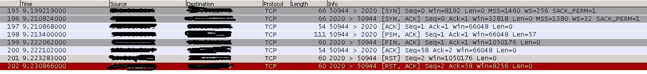 }//receive在这里,您可以看到我的Wireshark日志连接、发送数据和从服务器接收数据: