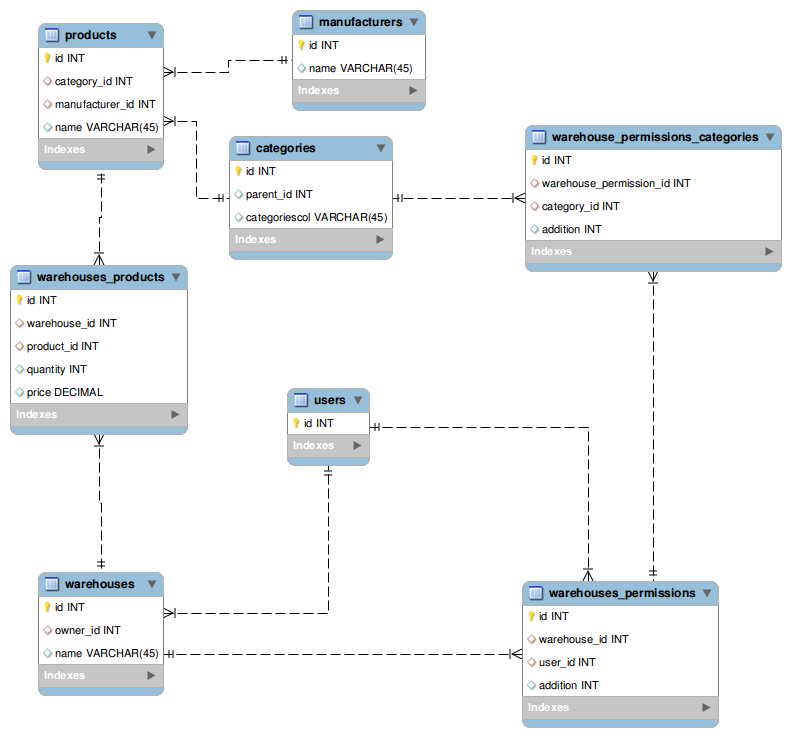 我会合并warehouses_permissions & warehouse_permissions_categories来解决大部分问题。如果以后需要的话,您可以将其划分或提出其他结构。