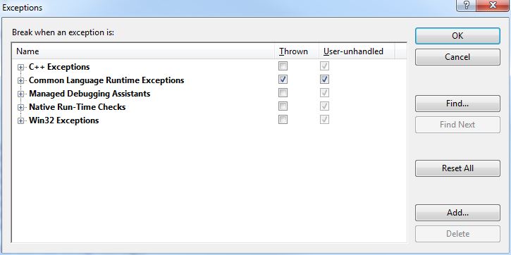 在Debug菜单中,有一个名为Exceptions...单击它的选项,并确保在这里取消选中“引发”复选框: