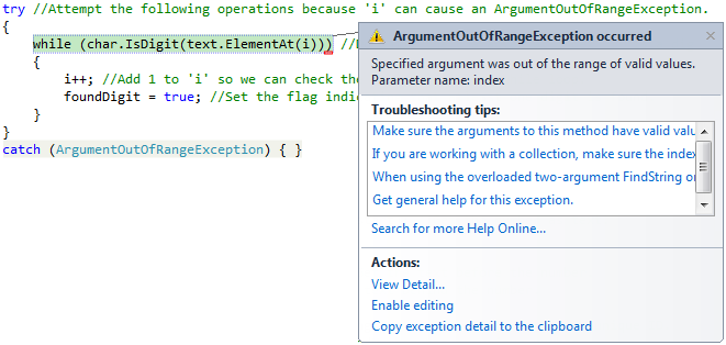 很多时候,您都希望看到上下文中的错误,即使它在try/catch中,这就是这个设置的目的。在这种情况下,这正是您应该做的,这样您就可以将i与text的长度进行比较,并查看您的问题所在。
