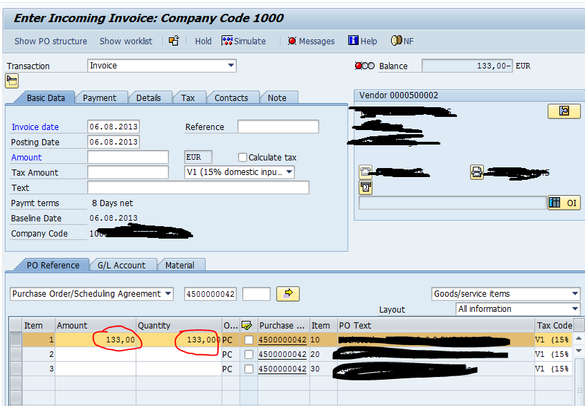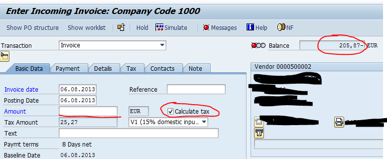 205,87-欧元。然后,我用正数'205,87‘填充'Amount’字段,以便文档“余额”变为0。
