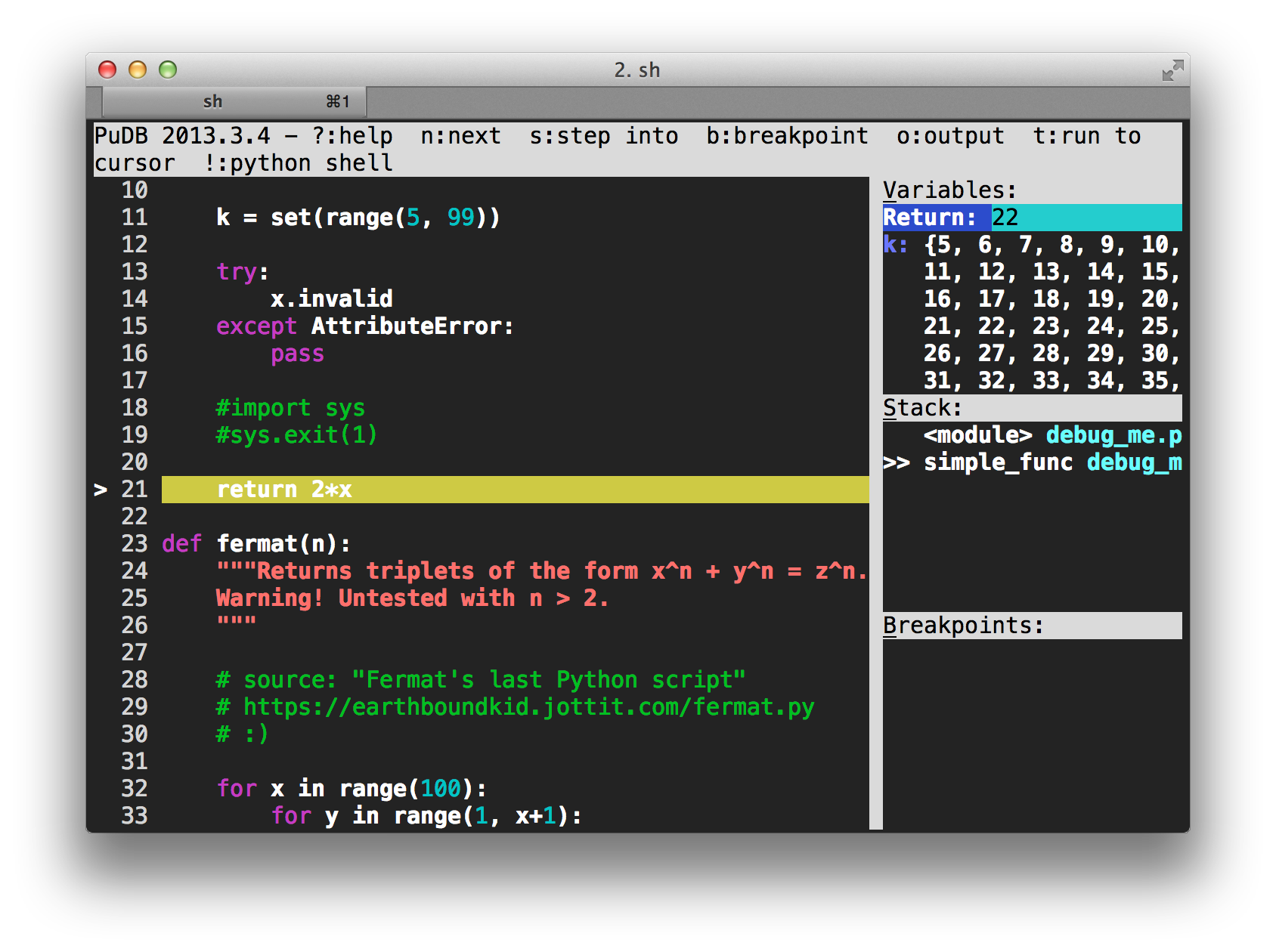 pdb是默认的Python调试器,它有一个无文档的(?) retval命令,如果您已经计算了它,它会打印当前函数的返回值,并且距离返回调用方框架只有一步之遥。