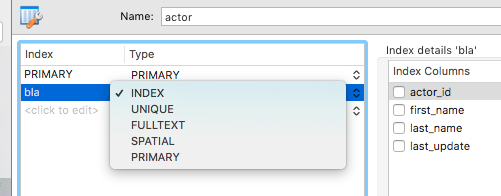 全文是索引类型,而不是列属性。创建索引时,可以选择任何索引、唯一类型、全文类型和主类型。请参阅“索引”选项卡上的表编辑器。