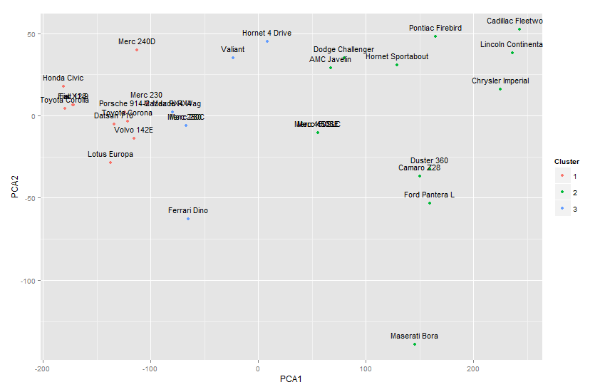 mydf<-data.frame(ID=names(pca1),PCA1=pca1, PCA2=pca2, Cluster=factor(cl$cluster))