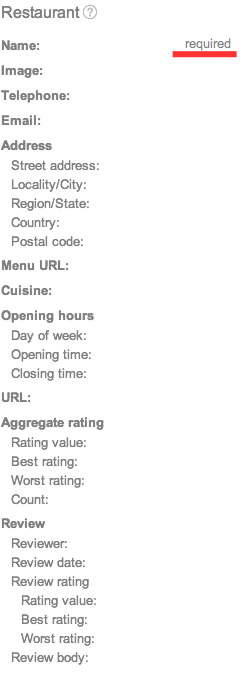 我试图添加一些结构化标记到我的餐厅列表网站使用结构化标记帮助(突出显示工具),从谷歌。
