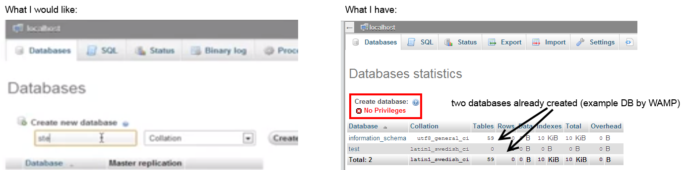 我有一个mySQL数据库问题--我是个新手:我已经安装了WAMP,我可以登录本地主机,然后使用phpmyadmin来显示下面的屏幕(右图像)。但我没有得到红色的xNo特权--我从网上的例子中看到了“创建新数据库”:
