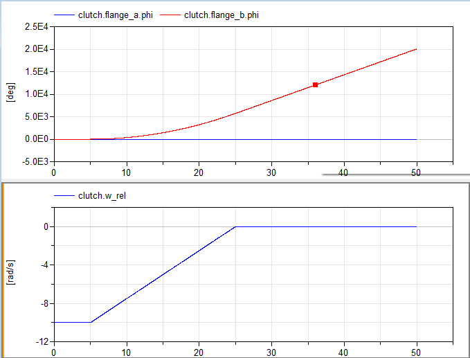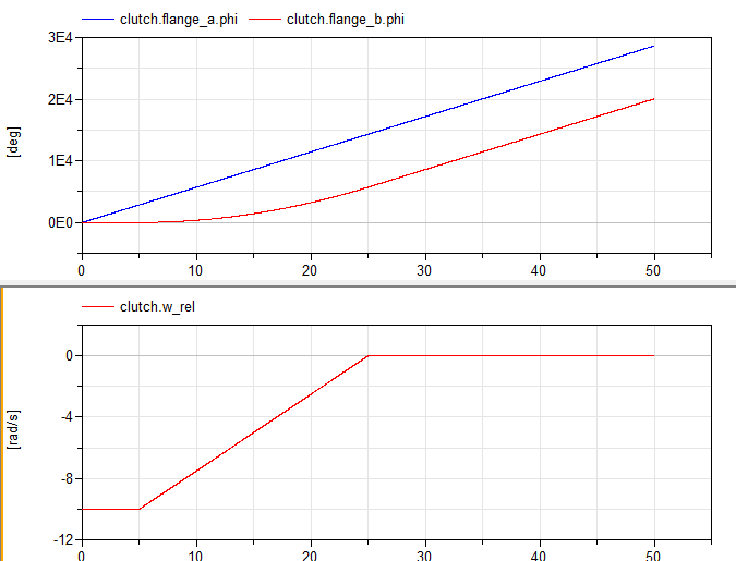 但是,第一个连接的行为非常不同。我们可以看到,它们都是法兰连接,角速度都是由flange_a/b.phi计算的,所以不管输入(realExperssion1)是什么,离合器中都没有角速度差。但有趣的是,当我模拟模型时,离合器的左法兰不动,右凸缘是旋转的。这是我结果的两幅图。